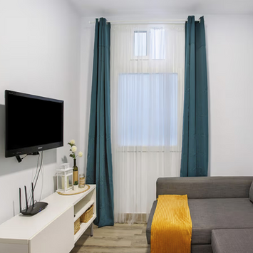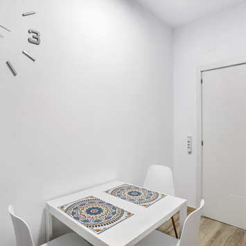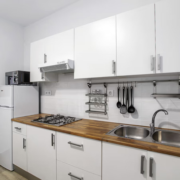 Apartamento de 45 m2 distribuidos en un dormitorio, salón con sofá cama y zona de trabajo, baño y cocina equipada.