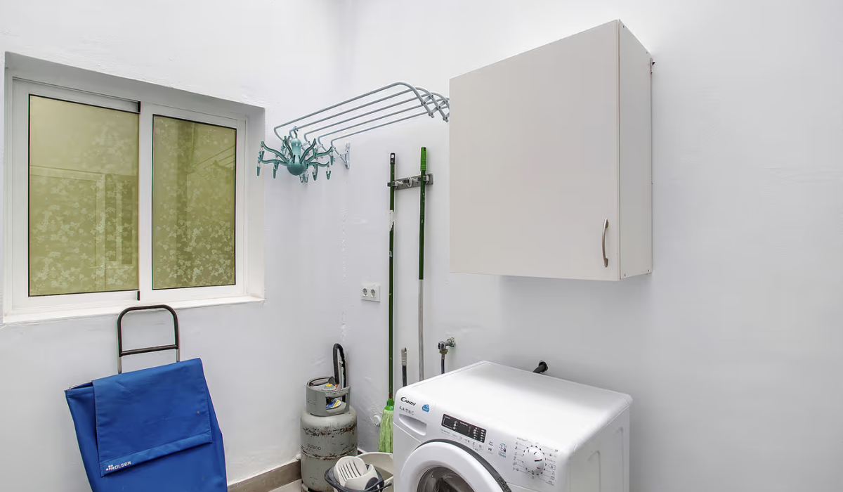 Lavadora, zona de tender la ropa, cepillo, recogedor, fregona y cubo