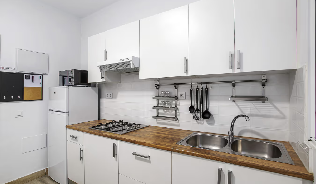 Nevera, Cafetera Nestlé Dolce gusto, hervidor de agua, sandwichera, microondas, sartenes, ollas, platos, vasos, cubiertos y utensilios de cocina, sal y azúcar.